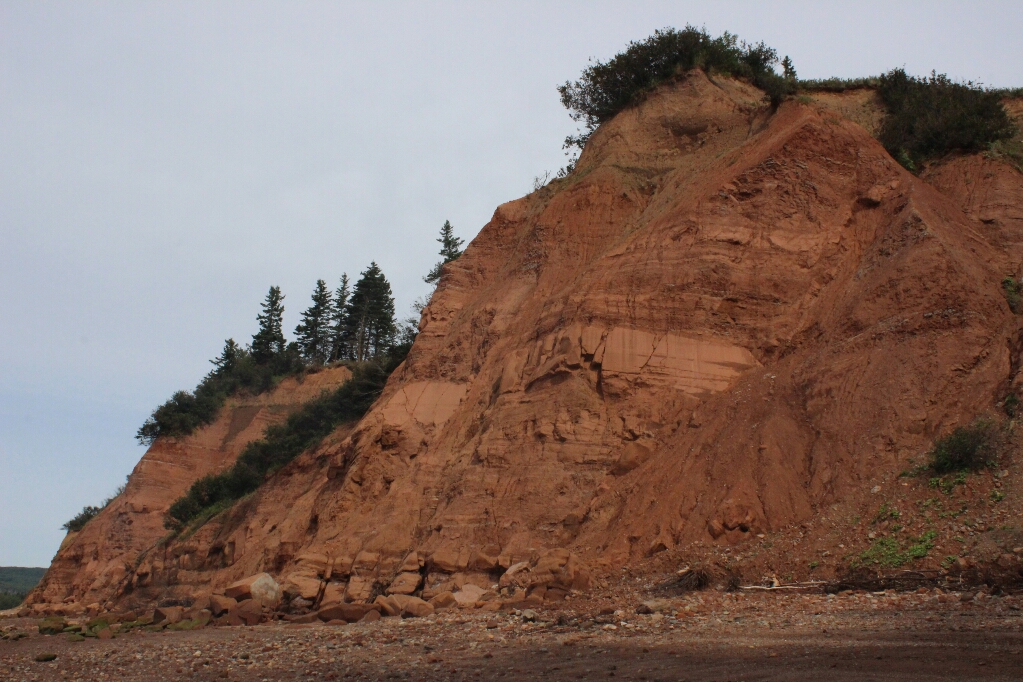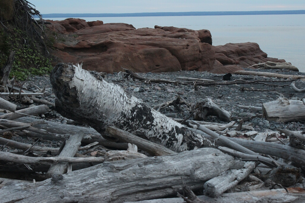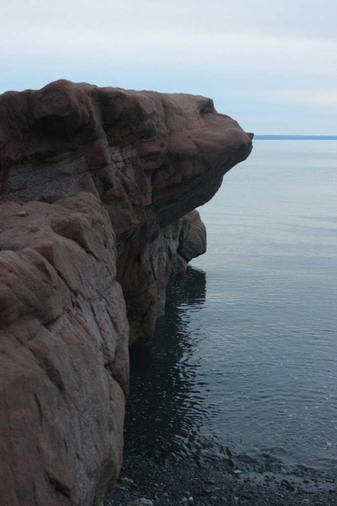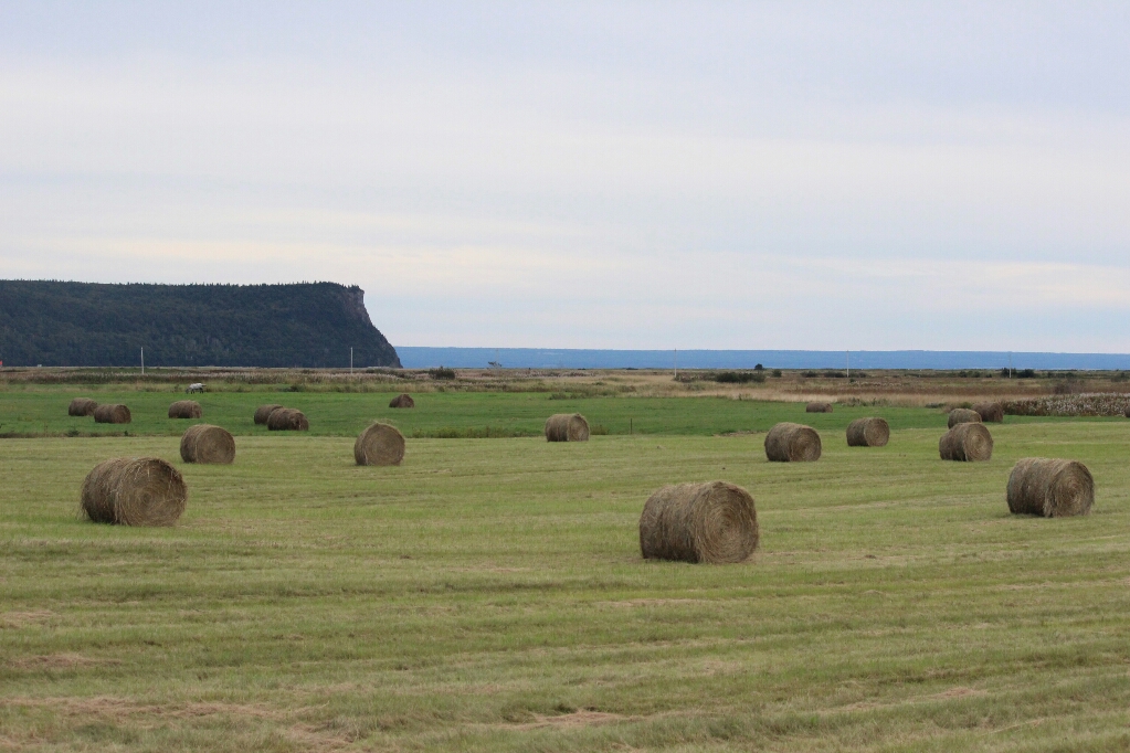 לאחר כשעה של נסיעה התחלנו להיות רעבים כי לא היה לנו אוכל בבוקר וחיפשנו מקום לשבת ולאכול. בדיוק נכנסנו לאזור האכדי, שבו התנופפו הדגלים המוכרים לנו מקוויבק ושמות הכפרים היו צרפתיים מאוד. אבל בכל הכפרים האלה, למרות שצפו אל הים והיו על דרך תיירותית מאוד לא מצאנו ספסלים ושולחנות עירוניים לשבת כמו בהרבה מקומות בקוויבק ובניו בראונסויק. הרעב התחיל לכרסם ולבסוף, נואשנו וישבנו על סלעים ליד כביש שהוליך לקמפינג. הרוח הייתה חזקה ולא היה כל כך נוח לשבת על הסלעים, כנראה שהפכנו מפונקים בשבועיים ומעלה שאנחנו מטיילים וחוגגים בארוחת צהריים בטבע ליד שולחנות עץ נוחים...