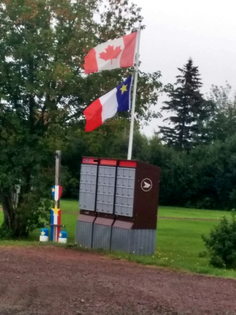 עכשיו משהו על האכדיים, שבאזור שלהם עברנו רוב היום ולמחרת. האכדיים הם המתיישבים הצרפתים הראשונים שהגיעו לעולם החדש והתיישבו בנובה סקוטיה ובניו בראונסויק. כשהאנגלים ניצחו את צרפת והשתלטו על השטח הם גירשו את הצרפתים ללואיזינה ועד מקומות בארה״ב. אחרי שנים הצרפתים חזרו, בעיקר לניו בראונסויק, והפצע הפתוח של הגירוש לא נסגר. לאורך כל הדרך ראינו דגלים שנראים כמעט כמו הדגל של צרפת, אבל עם כוכב צהוב קטן. חשבנו שזה הדגל של ניו בראונסויק,