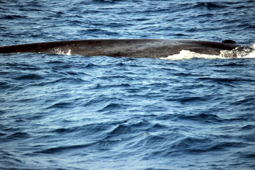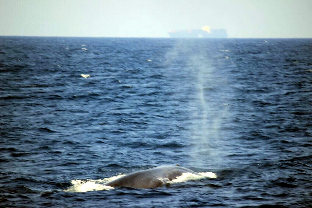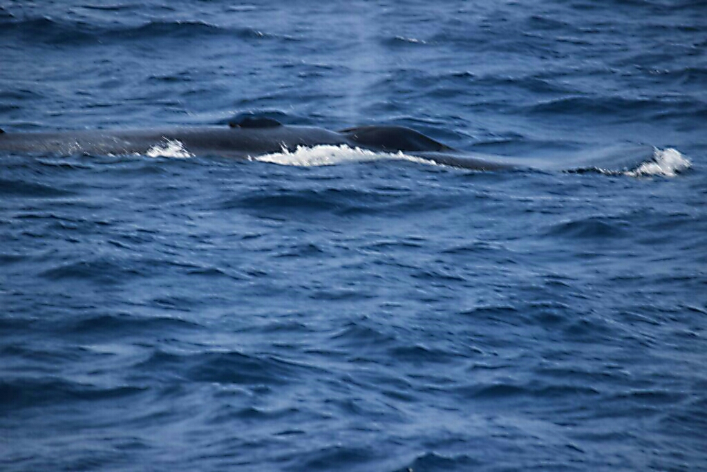 עלינו למעלה וההפלגה הייתה מאוד נעימה, הים היה די שקט, השמיים בהירים והרוח נעימה. שטנו כשעתיים עד למקום בו אמורים להיות הלווייתנים ולפתע ראינו דולפינים מקפצים קרוב אלינו ולספינות דומות אחרות שהיו לידינו. המשכנו ואז ראינו את הלוויתן הראשון, כל כך גדול שאי אפשר לראות את כולו, קודם כל רואים את השפריץ של הרדים היוצאים ואז רואים את הראש שנכנס מיד למים, ואז את החלק המרכזי של הגוף ולבסוף את הזנב ומכיוון שהיינו ברי מזל ראינו גם את הזנב מתרומם כשהוא יורד למים. אחר כך ראינו מרחוק שני ״ממטרות״ של לוויתנים אבל כשהתקרבנו הם צללו ונעלמו. ואז ראינו לווייתן מיד מתחת לפני המים, כמעט מעליהם, שוכב בשלווה וגופו הענק נראה ברור בייחוד אחרי שהתקרבנו בשקט. בהדרכה בתחילת השייט הזהירו אותנו לא לצעוק כדי לא להפחיד את הלווייתנים ולכן כל מה שיכולתי לעשות היה ׳לצעוק בלחש׳ עם המון אוויר שנכנס לגרון...