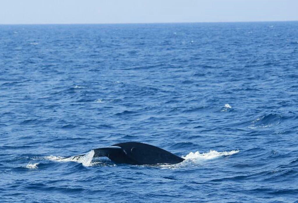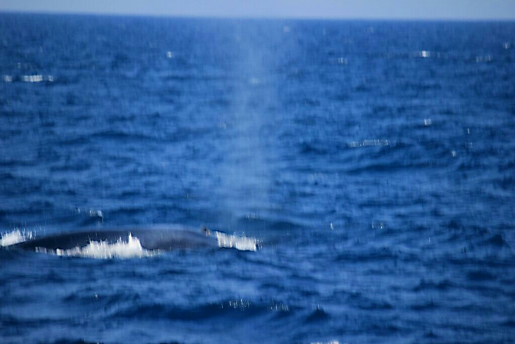 עלינו למעלה וההפלגה הייתה מאוד נעימה, הים היה די שקט, השמיים בהירים והרוח נעימה. שטנו כשעתיים עד למקום בו אמורים להיות הלווייתנים ולפתע ראינו דולפינים מקפצים קרוב אלינו ולספינות דומות אחרות שהיו לידינו. המשכנו ואז ראינו את הלוויתן הראשון, כל כך גדול שאי אפשר לראות את כולו, קודם כל רואים את השפריץ של הרדים היוצאים ואז רואים את הראש שנכנס מיד למים, ואז את החלק המרכזי של הגוף ולבסוף את הזנב ומכיוון שהיינו ברי מזל ראינו גם את הזנב מתרומם כשהוא יורד למים. אחר כך ראינו מרחוק שני ״ממטרות״ של לוויתנים אבל כשהתקרבנו הם צללו ונעלמו. ואז ראינו לווייתן מיד מתחת לפני המים, כמעט מעליהם, שוכב בשלווה וגופו הענק נראה ברור בייחוד אחרי שהתקרבנו בשקט. בהדרכה בתחילת השייט הזהירו אותנו לא לצעוק כדי לא להפחיד את הלווייתנים ולכן כל מה שיכולתי לעשות היה ׳לצעוק בלחש׳ עם המון אוויר שנכנס לגרון...