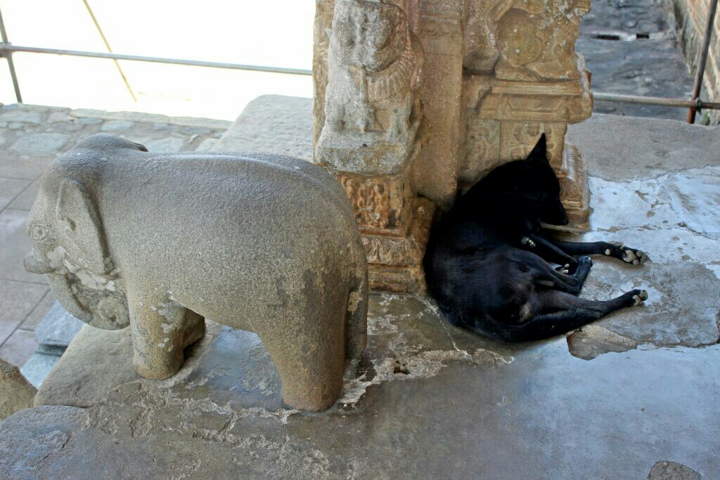 מהמקדש הזה נסענו עוד כשעה צפונה למקדשים שנמצאים במערות החצובות בסלע בזלתי עצום הנמצא בראש הר גבוה. הנהג העלה אותנו בכביש אחורי שחסך לנו חלק גדול מחמש מאות המדרגות המובילות אל המערות. אבל עדיין טיפסנו די הרבה בדרך מרוצפת אבנים ולבסוף במדרגות תלולות.