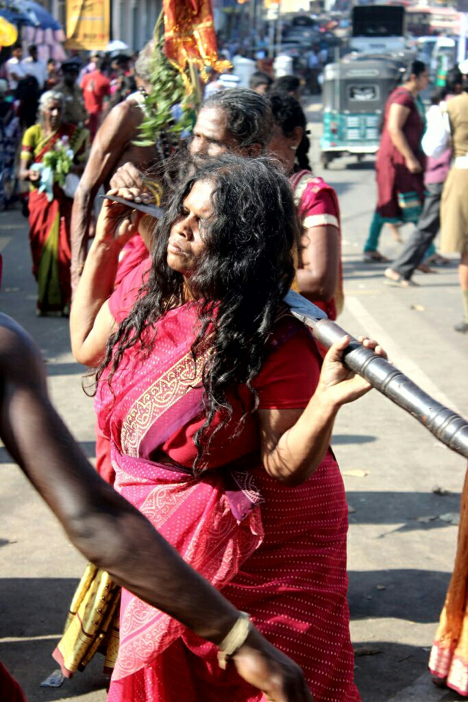 אישה שעמדה על ידי שאלה אם אנחנו איטלקים וסיפרה שאף על פי שהיא בודהיסטית יש לה טיקה (נקודה אדומה שעושים הכוהנים לנשים במקדשים ההינדים) לאות הזדהות עם החג של הטמילים בעיר.