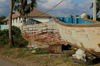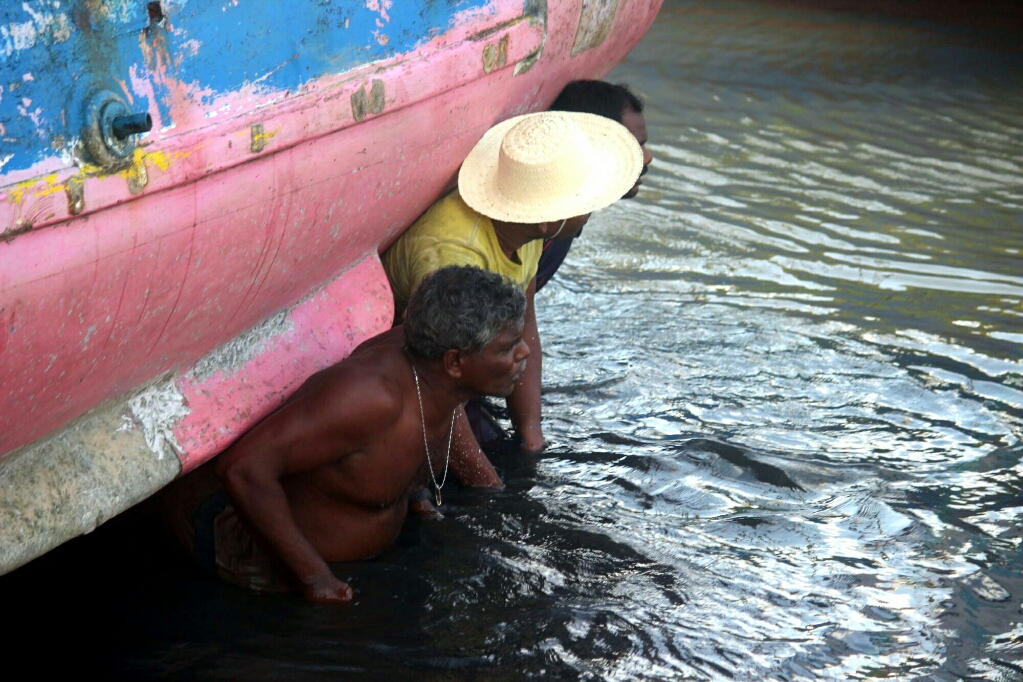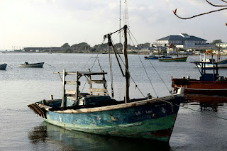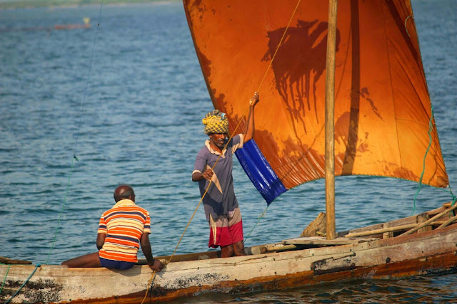 התקרבנו לנמל וראינו המון סירות דייגים, רובן בלי מנוע ובלי מפרש, ודייגים מקבעים את הספינה במים בעזרת קורת עץ גדולה שהם תוקעים מתחתיה. המים במפרץ מאוד רדודים, כי כל האזור בין היבשה והאיים שלידו והודו שמצפון, היו מחוברים פעם והים כיסה את החיבור. לכן אין שם מים עמוקים וזה לא יכול להיות נמל לספינות גדולות.