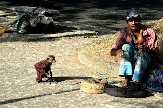 הנסיעה הייתה נוחה וקצרה, וכשהגענו לעיר ועצרנו בתחנת אוטובוסים גדולה, שאלנו את הכרטיסן אם זה המקום בו אנחנו צריכים לרדת, והוא לא כל כך ידע לענות. עמדנו על המדרגות של האוטובוס והתלבטנו. אפי אמר שהוא חושב שאנחנו צריכים להמשיך ולרדת בתחנה הבאה, הקרובה יותר לעתיקות ולכן גם למלון. ואז נדחף לשיחה נהג טוקטוק גדול קומה ושערו הארוך אסוף בקוקו מעל ראשו, וצעק ודיבר בסמכותיות אל הכרטיסן שאנחנו צריכים לרדת עכשיו, והכרטיסן המסכן התחיל להוריד את החפצים שלנו, למרות שאמרנו לו שאם הוא ממשיך הלאה אנחנו צריכים לנסוע אתו. ירדנו ונהג הטוקטוק ראה את הכתובת ואמר מיד, זה רחוק מאוד, ארבעה קילומטרים, ארבע מאות רופי, וחיוך של שביעות רצון על פניו, כמו דייג המחייך בסיפוק כשהוא מעלה שני דגים לבנים שמנמנים וזקנים בחכתו... אפי צלצל למלון ושאל כמה צריכה לעלות נסיעה כזאת, ונענה שרק שלוש מאות חמישים.