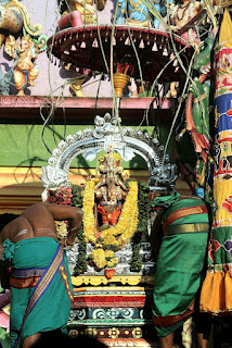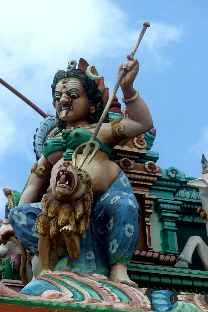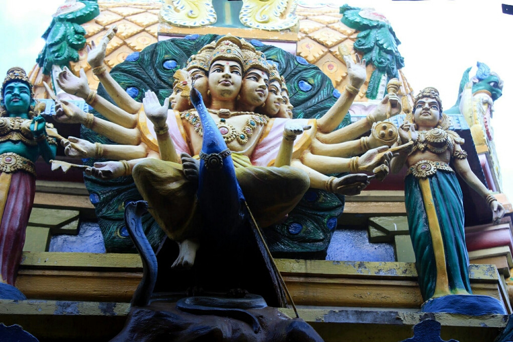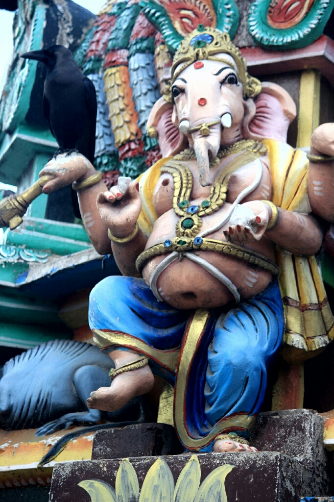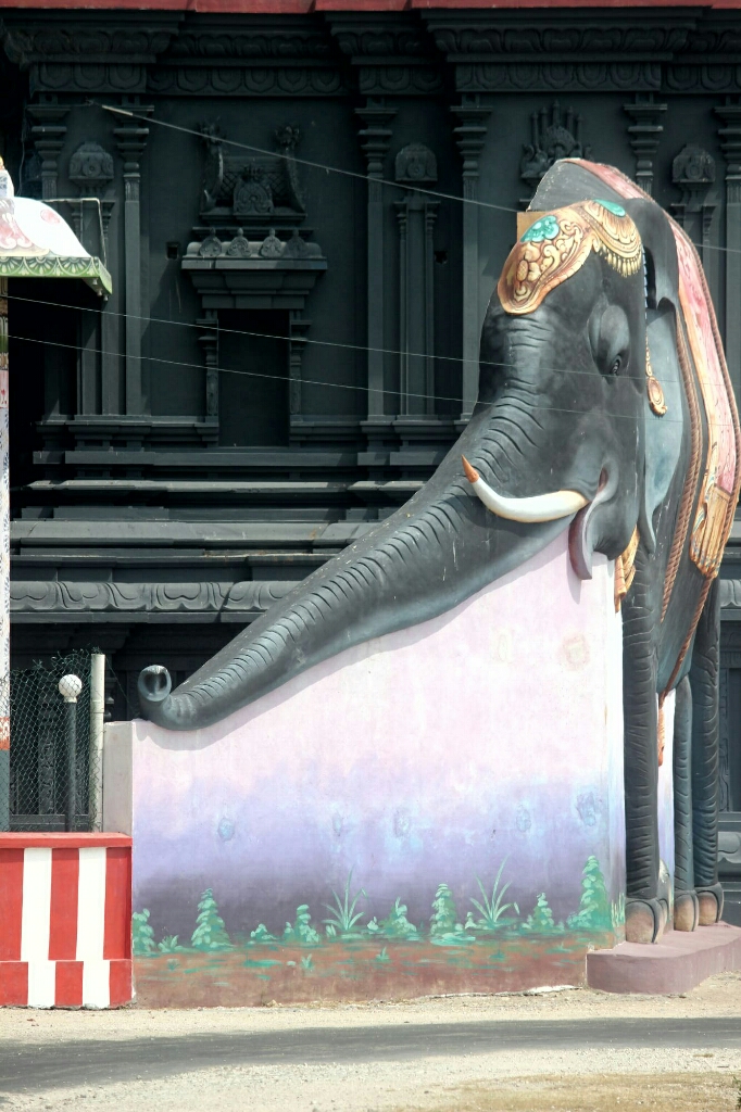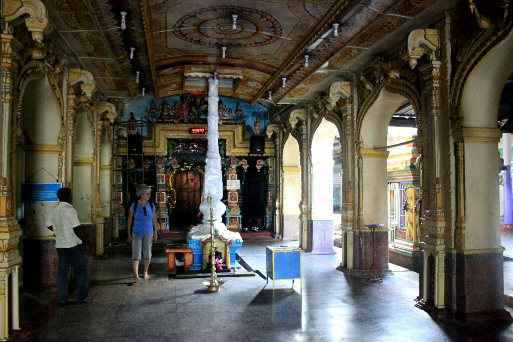 המשכנו ברגל למקדש ההינדי הקרוב. ובאמת, זו הייתה האטרקציה האמיתית באי הזה. מגדל גבוה עם פסלים צבעוניים במיטב הסגנון של דרום הודו, המון ציורים יפים וצבעוניים על התקרה של מרפסת הכניסה הגדולה, והשיא: שני פילים ענקיים בולטים מהחומה משני צדי השער הגדול. ללא ספק מקדש מרשים, ושוב נפלנו על טקס עם תופים ומוזיקה הודית ברמקולים.