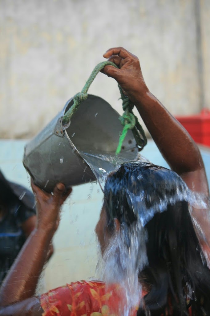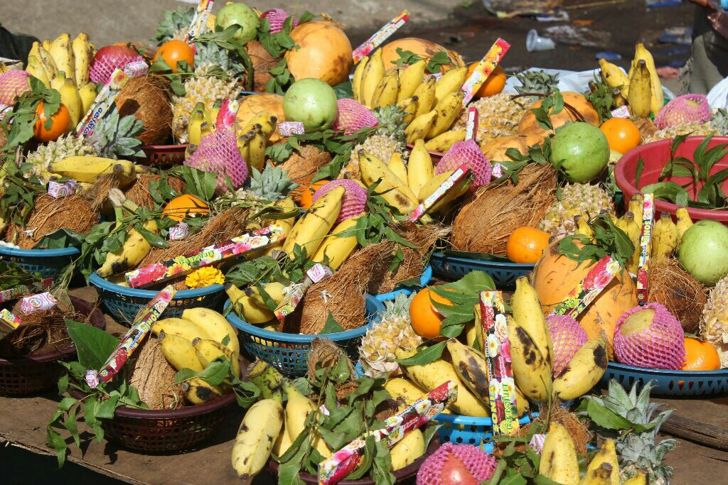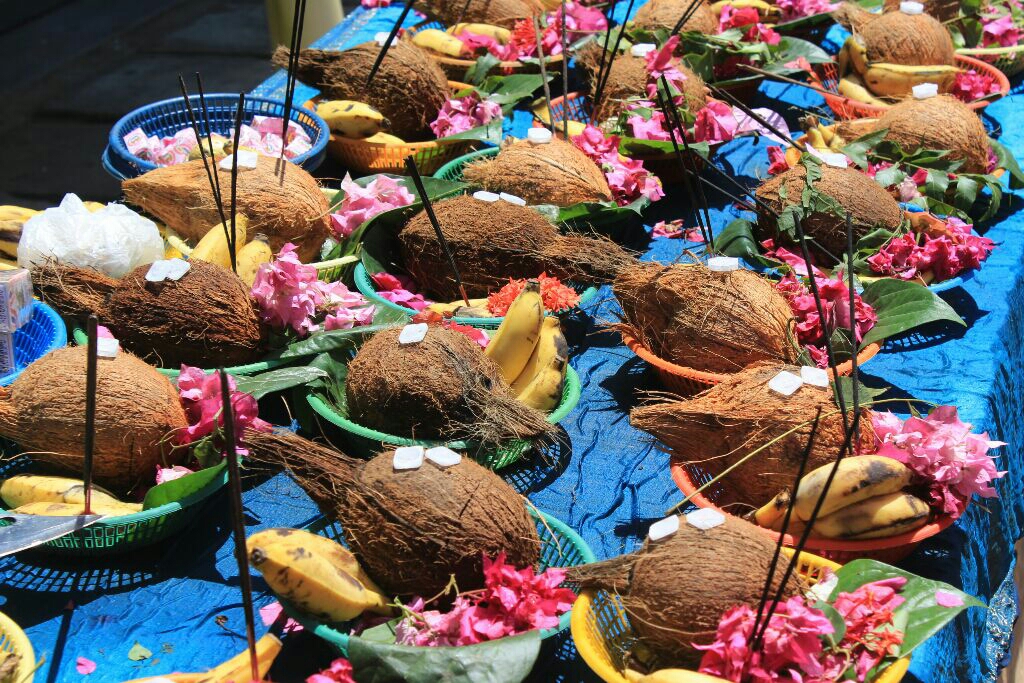 אנשים ניגשו לעגלה והגישו לכוהנים צלחות קש קטנות עם פרחים ובננות ואגוז קוקוס וקיבלו בחזרה את הצלחת עם הכל חוץ מחצי אגוז אחרי שהכוהנים בירכו עליה. אחרי המרכבה נסעה משאית מלאה חצאי קוקוסים שמדי פעם זרקו לתוכה עוד חצאים. אין לי מושג מה עושים עם כל כך הרבה חצאי אגוזים.