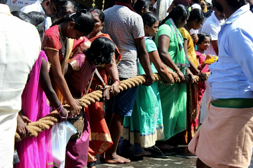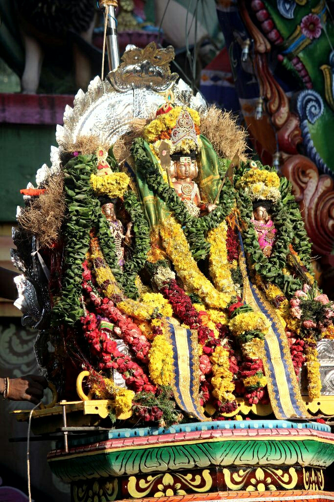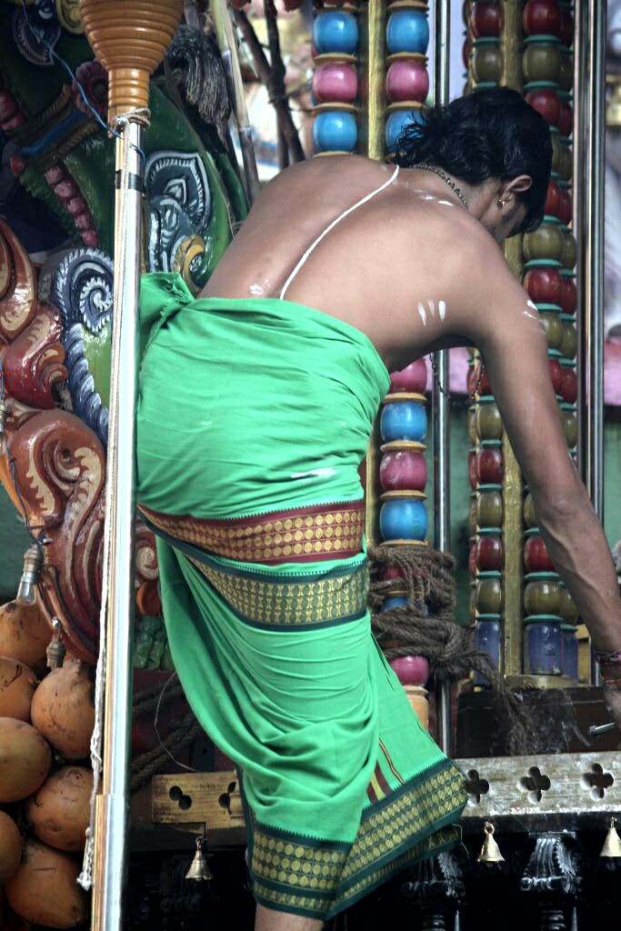 שוטרים שעמדו ושמרו שההמון לא יגלוש לכביש שרקו ועצרו את התנועה, והעבירו את הנשים הרוקדות וחלק מהקהל שצפה בהם את הכביש לתוך המקדש. ושוב חזרה התנועה לזרום עד שנראתה המרכבה הראשונה מתקרבת ומגיעה, תוך כדי עצירות מרובות עד למקום בו הייתה צריכה לפנות בתשעים מעלות כדי להיכנס לחצר המקדש, בפתח הכניסה הגדול. עמדנו ליד הפתח, צמודים לקיר פח נמוך בגובה המותניים של חנות שמכרה מנחות וצעיפים. מושכי החבלים התקרבו, וכמעט חצו אל הכביש אך נעצרו שוב ושוב על ידי המארגן, גבר כסוף שיער גבוה ומלא, שהלך לידם ונתן הוראות בשקט במיקרופון שהחזיק בידו. אחרי כמה פעמים בהן המרכבה הסתובבה מספיק, מושכי החבלים חצו את הכביש ועברו בשער, ממש לידינו. בחור צעיר עם תספורת אופנתית עמד וצילם בטלפון את המושכים, וחבר שלו מביניהם צעק לו וזרק אליו את השעון שלו שכנראה הפריע לו למשוך, ורמז לו שיצלם אותו...