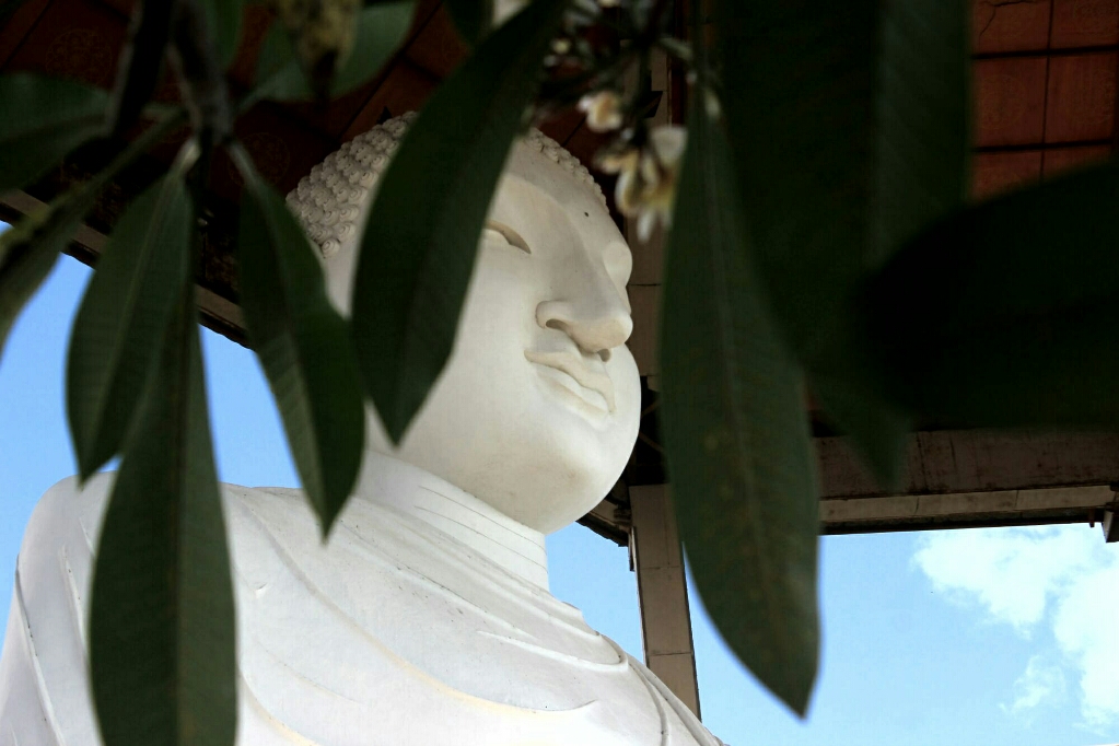 בתוך המקדש היו הרבה מאוד עולי רגל, נשים בלבן ישבו על הרצפה ליד הכניסה, והקשיבו לנזיר שקרא משהו כשהן מחזיקות בידיהן חוטים לבנים שנקשרו לבקבוקים גדולים שהיו לידו. בתוך המקדש היו אנשים שהניחו מנחות פרחים ליד פסל הבודהה ובמקומות אחרים, ועמדו בשקט כשכפות ידיהם צמודות. קבוצה של נשים ישבה מחוץ למקדש ושרה המנוני תפילה מתוך דפים שהחזיקו בידיהן. הייתה שם אווירה של קדושה ואמונה תמימה ופרחי הלוטוס הרבים שהונחו כמנחות בכל מקום הוסיפו יופי קסום למקדש.
