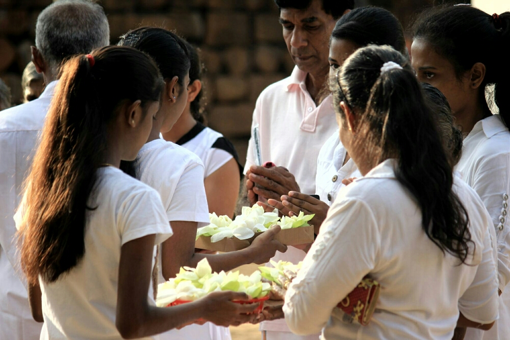 היו שם עולי רגל לבושים לבן ומחזיקים מנחות ופרחי לוטוס, ואסור היה להיכנס למתחם עם נעליים או כובע, כמו במקדשים פעילים. אחרי הטיפוס נחנו קצת במרפסת מכוסה המיועדת לעולי הרגל, וראינו שורת תלמידות בתלבושת הלבנה והצמות הקלועות וקשורות בסרטים לבנים, ואחריהם שורת תלמידים לבושים לבן, כולם הולכים בזוגות ומתנהגים למופת, אם כי מגניבים חיוכים ביישנים אלינו ומנופפים בתגובה לנפנוף שלנו.