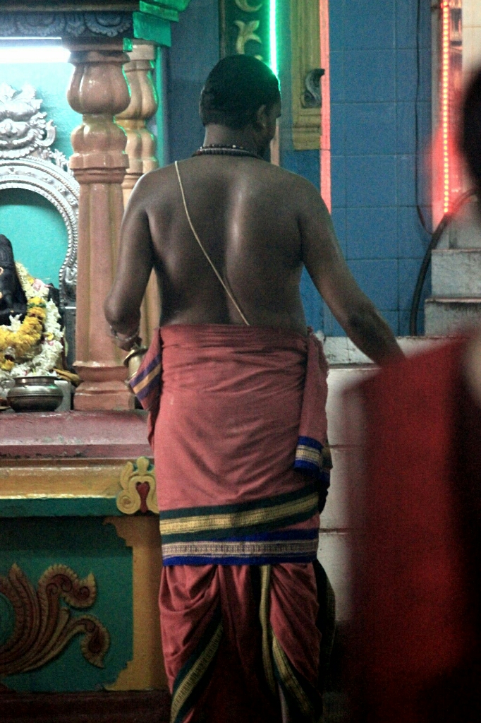 שוטטנו במקדש וראינו את הציורים הענקיים בצבעים ההינדיים הרגילים, אדום, ירוק, לבן אבל הגודל העצום שיווה הוד והדר למקדש, וכמובן הניקיון המוחלט שכמוהו לא זכור לי במקדשים ההינדים בהודו. קבוצת אנשים בסרונג לבן עמדה מול כל אחד מהמגדלים הצבעוניים כשכפות ידיהם צמודות מעל הראש והשתהו כך כשהם מרוכזים ודוממים.