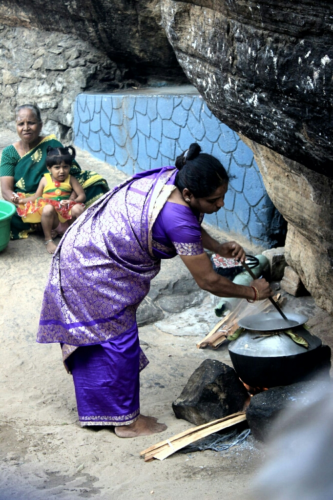 המרכבה הבאה הייתה עוד רחוקה מאוד במעלה הרחוב ואני כבר הייתי רעבה, אז החלטנו ללכת לרחוב הראשי שלידנו ולמצוא משהו לאכול. אכלנו כמה מאפים, והמשכנו ברחוב הראשי בין הדוכנים והלכלוך והמכוניות והטוקטוקים והאוטובוסים, שצפרו והוסיפו למהומה. חיפשנו מקום לשבת, ומצאנו מלון מהודר שבקומה הראשונה שלו הייתה מסעדה. היו שם מאווררים ובחוץ היה די חם. אכלנו גלידה וישבנו עוד קצת, ואז ראינו שמתאספים המונים בקצה הרחוב של המרכבות ליד המקדש. תזמורת של מתופפים וחצוצרה צווחנית ניגנה, והייתה שם קבוצת נשים לבושות סארי כתומים, אחת מהם החזיקה קלשון של שיווה ועליו צעיף כתום כמו שנוהגים הסאהדו בהודו, ואחת מלאה מאוד עם שיער פרוע, החזיקה בידה מצ׳טה גדולה וכולן רקדו בדבקות ובאקסטזה. אנשים עמדו סביבם והסתכלו בהן אך לא הצטרפו להתלהבות. בכלל, גם ליד המרכבות לא ראינו שיכרון חושים והתלהבות עילאית אלא שימחה ועליזות וחיוכים לעברנו ולעבר כל מי שעבר לידם.