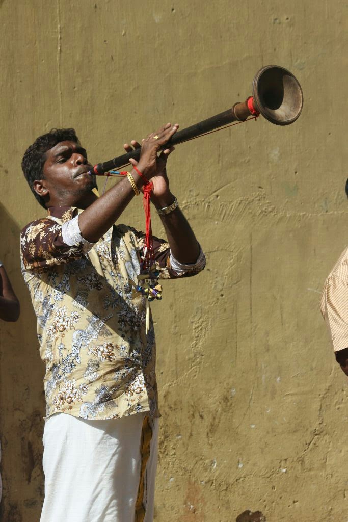עכשיו הייתה בחצר המקדש צפיפות גדולה וכל הזמן נכנסו עוד אנשים. באמצע החצר עמדה תזמורת קטנה של ארבעה מתופפים, שניהלה קונצרט שלם של תיפופים ודיאלוגים בין תופים, וכולם עמדו סביבם והקשיבו. המרכבות עמדו בתוך החצר במקומות שונים, ולידן הוצבו מין שמשיות מעוטרות בקישוטי מתכת ובנורות צבעוניות. לאט לאט, עלו הכוהנים על כל מרכבה, הורידו מהן בזהירות את האלים המכוסים פרחים, ושמו אותם מתחת לשמשיות על אפיריונים, המונחים על שני מוטות במבוק עבים שנישאו בידי צעירים חשופי חזה. הצעירים נדנדו את האפיריונים ימינה ושמאלה, והתקדמו טיפה מקצה החצר לכיוון האמצע. המרכבה הגדולה ביותר שעליה הייתה האלה פאטאטיני, האלה המקומית של האזור שהיא בעצם מרכז האירוע, עמדה מתחת לשער וליד קיר גבוה ובו חלון גדול. הכוהנים טיפסו על המרכבה ובזהירות רבה הורידו אותה, לאחר שהורידו קישוט ירוק גדול, כתר כסוף