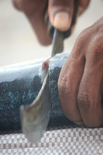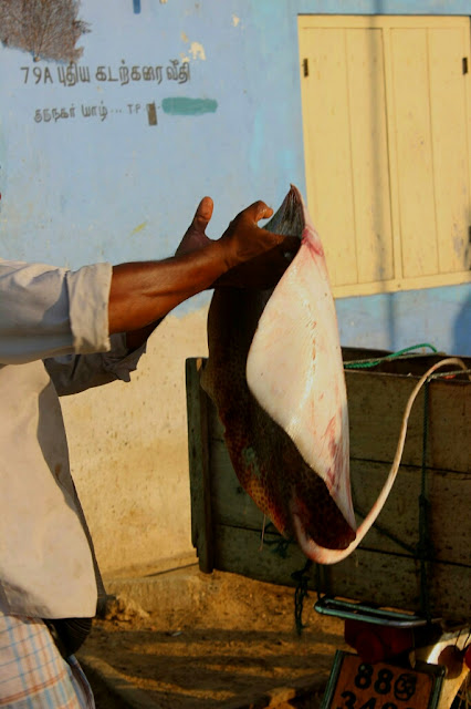 ואכן, בבוקר נסענו לעיר, השארנו את התיק לתיקון אצל מין סנדלר, וביקשנו מנהג הטוקטוק שיקח אותו מהתיקון אחרי שיביא אותנו לשוק הדגים. השוק הענק, משתרע על רחבה גדולה מאוד ממש ליד הים, עם דוכנים מכוסים שעליהם מונחים דגים מכל הסוגים ובכל הגדלים, מסרדינים קטנים ושרימפסים קטנטנים, ועד לחלקי דגי טונה בשרניים, צלופחים, כרישים צעירים, ועוד דגים בכל הצבעים והדגמים.
