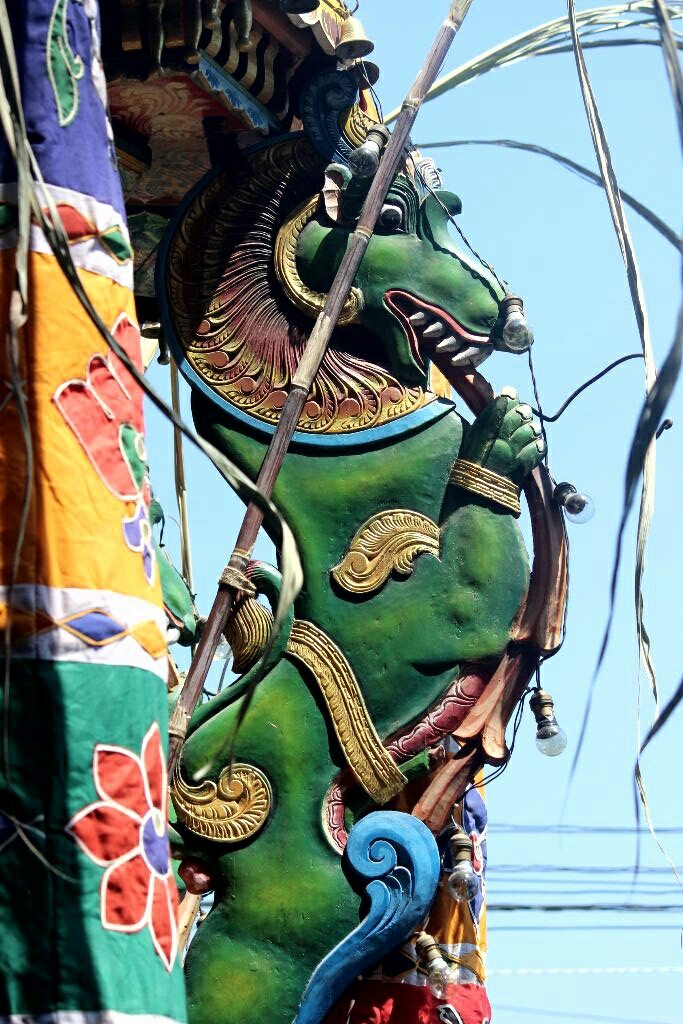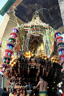 אנשים ניגשו לעגלה והגישו לכוהנים צלחות קש קטנות עם פרחים ובננות ואגוז קוקוס וקיבלו בחזרה את הצלחת עם הכל חוץ מחצי אגוז אחרי שהכוהנים בירכו עליה. אחרי המרכבה נסעה משאית מלאה חצאי קוקוסים שמדי פעם זרקו לתוכה עוד חצאים. אין לי מושג מה עושים עם כל כך הרבה חצאי אגוזים.