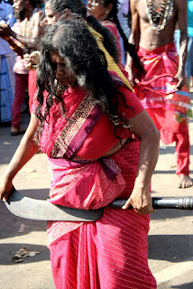 המרכבה הבאה הייתה עוד רחוקה מאוד במעלה הרחוב ואני כבר הייתי רעבה, אז החלטנו ללכת לרחוב הראשי שלידנו ולמצוא משהו לאכול. אכלנו כמה מאפים, והמשכנו ברחוב הראשי בין הדוכנים והלכלוך והמכוניות והטוקטוקים והאוטובוסים, שצפרו והוסיפו למהומה. חיפשנו מקום לשבת, ומצאנו מלון מהודר שבקומה הראשונה שלו הייתה מסעדה. היו שם מאווררים ובחוץ היה די חם. אכלנו גלידה וישבנו עוד קצת, ואז ראינו שמתאספים המונים בקצה הרחוב של המרכבות ליד המקדש. תזמורת של מתופפים וחצוצרה צווחנית ניגנה, והייתה שם קבוצת נשים לבושות סארי כתומים, אחת מהם החזיקה קלשון של שיווה ועליו צעיף כתום כמו שנוהגים הסאהדו בהודו, ואחת מלאה מאוד עם שיער פרוע, החזיקה בידה מצ׳טה גדולה וכולן רקדו בדבקות ובאקסטזה. אנשים עמדו סביבם והסתכלו בהן אך לא הצטרפו להתלהבות. בכלל, גם ליד המרכבות לא ראינו שיכרון חושים והתלהבות עילאית אלא שימחה ועליזות וחיוכים לעברנו ולעבר כל מי שעבר לידם.