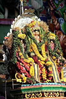 ואז כשכל האלים מונחים על האפיריונים עם השמשיות, הם התקדמו והסתובבו לכיוון הכניסה למקדש עצמו, וההמונים הצטופפו יותר ויותר כי חלק רצו לעמוד בכניסה למקדש ולצפות באפיריונים, וחלק רצו ללוות אותם בסיבוב שעמדו לעשות סביב המקדש. היה באמת צפוף והשוטרים דחפו את כולם לתוך המקדש, ואנחנו כבר ידענו שלא נוכל להיכנס למקדש, כי קצת קודם לפני שהאלים הורדו ניסינו, והתבקשנו לצאת על ידי סדרן במדים אדיב אך תקיף. החלטנו לצאת מהחצר ולוותר על הסוף, והלכנו נגד הזרם מחזיקים אחד בשני כדי לא ללכת לאיבוד בהמון.