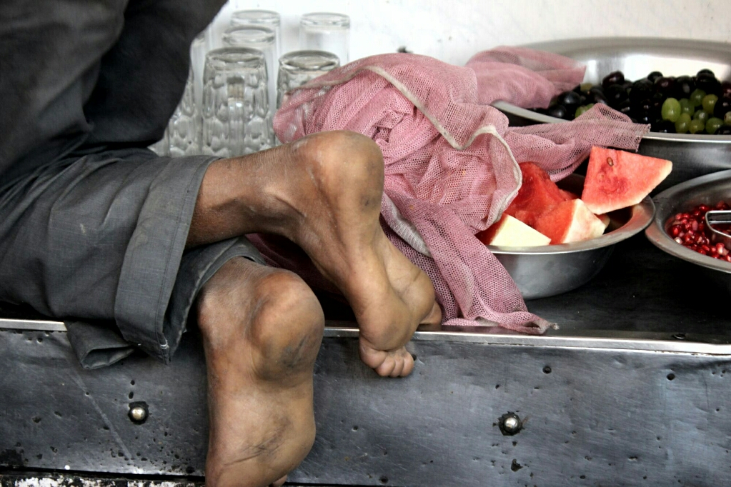| והרגליים שלו בתוך סל הפירות |