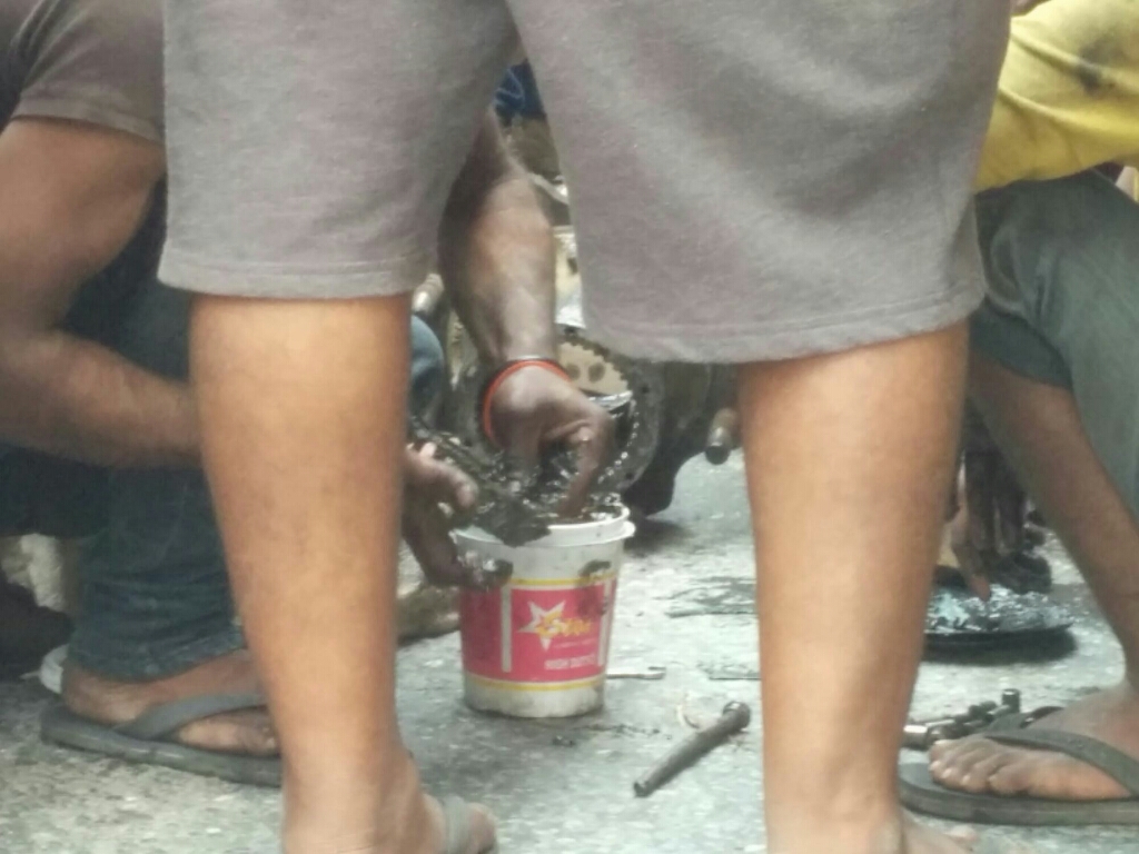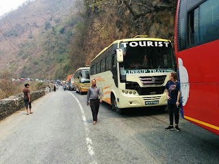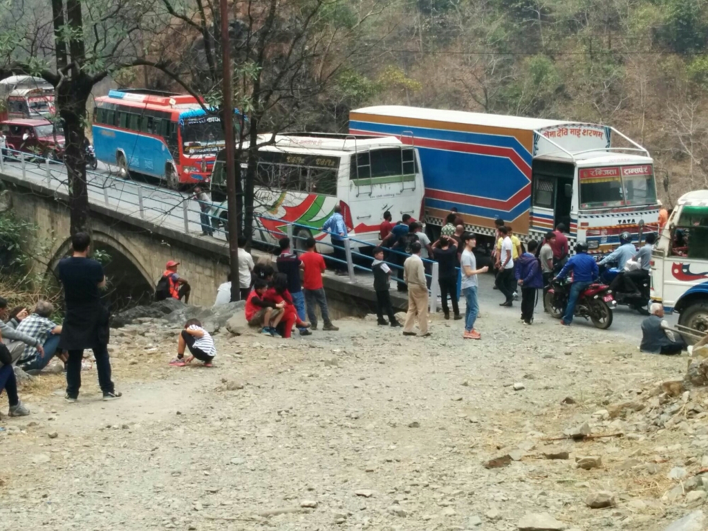 היה חם באוטובוס כי הנהג כיבה את המנוע והמיזוג שאמנם פעל רק כמאוורר הפסיק לעבוד, יצאנו מהאוטובוס ועמדנו עם כל הנוסעים בצד הדרך. פגשנו שם משפחה ישראלית אמא בת ובן מבוגרים, שסיפרו על שהות של שלושה ימים בבית של משפחה נפאלית שאימצו אחרי רעידת האדמה. הם הוציאו גזיה ועשו קפה שחור טעים. בכל הכאוס שהשתרר בכביש היה שקט וסדר כשהרכבים הקטנים והאופנועים מצליחים לעבור והשוטר שהגיע לאחר כחצי שעה אמנם סידר את המעבר ולא נתן למכוניות להתגנב ולחתוך את התור, אך גם בלעדיו הכל הסתדר איכשהו בלי מריבות וצעקות.