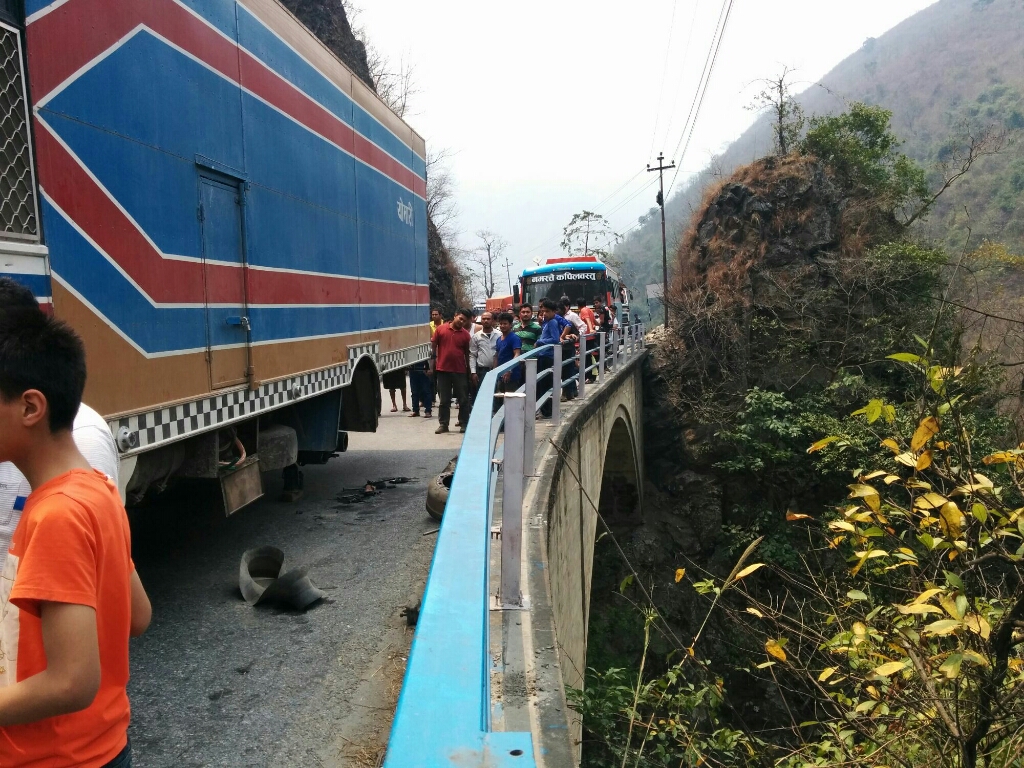 כחצי שעה אחרי שחזרנו לנסוע התקרבנו לגשר שבו עמדה משאית גדולה לא בצד אלא קרוב לאמצע, כך שרק מכוניות קטנות או ג׳יפים יכלו לעבור לידה, ואילו האוטובוס שלנו וזה שלפנינו לא הצליחו, מה שהתברר אחרי שהאוטובוס ניסה לעבור ונתקע צמוד למשאית. עמדנו וחיכינו הרבה זמן והתברר שהתקלה במשאית אינה רק תקר בגלגל כמו שהתרשמנו בתחילה, וכל הנהגים של האוטובוסים הגדולים שעמדו בשורה ארוכה אחרינו הגיעו למשאית, ונתנו עצות והתדיינו איך לתקן אותה. מכוניות קטנות, ג׳יפים, טנדרים ואפילו אוטובוסים פשוטים לא לתיירים ובלי מיזוג אוויר, הצליחו להשתחל במעבר הצר, ורק האוטובוסים היקרים של התיירים והמקומיים שיכלו להרשות לעצמם, נשארו תקועים לחכות עד שהמשאית תתוקן. אין ספק שהיה פה צדק פואטי מסוים...