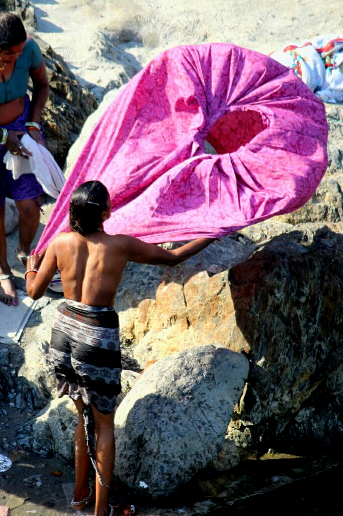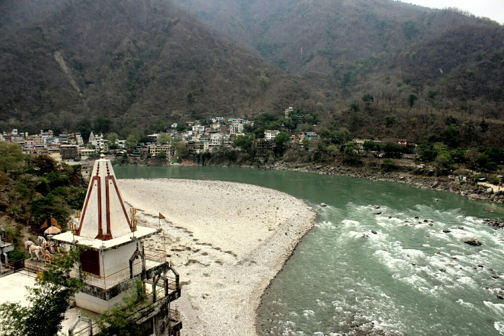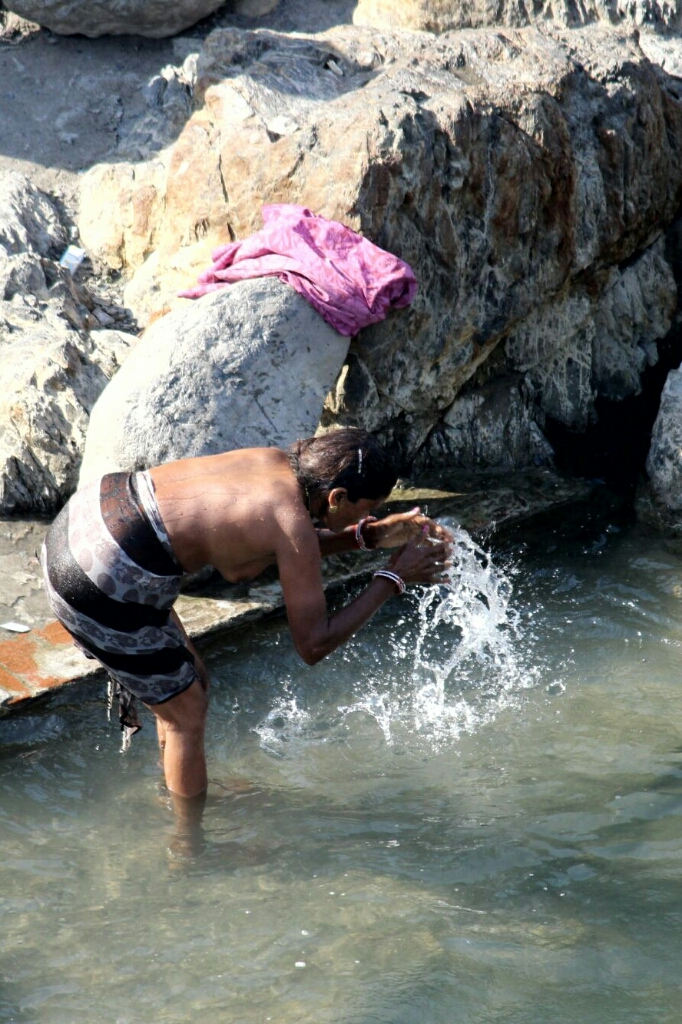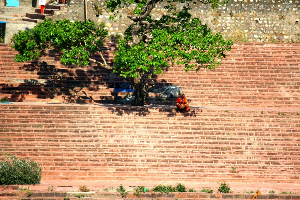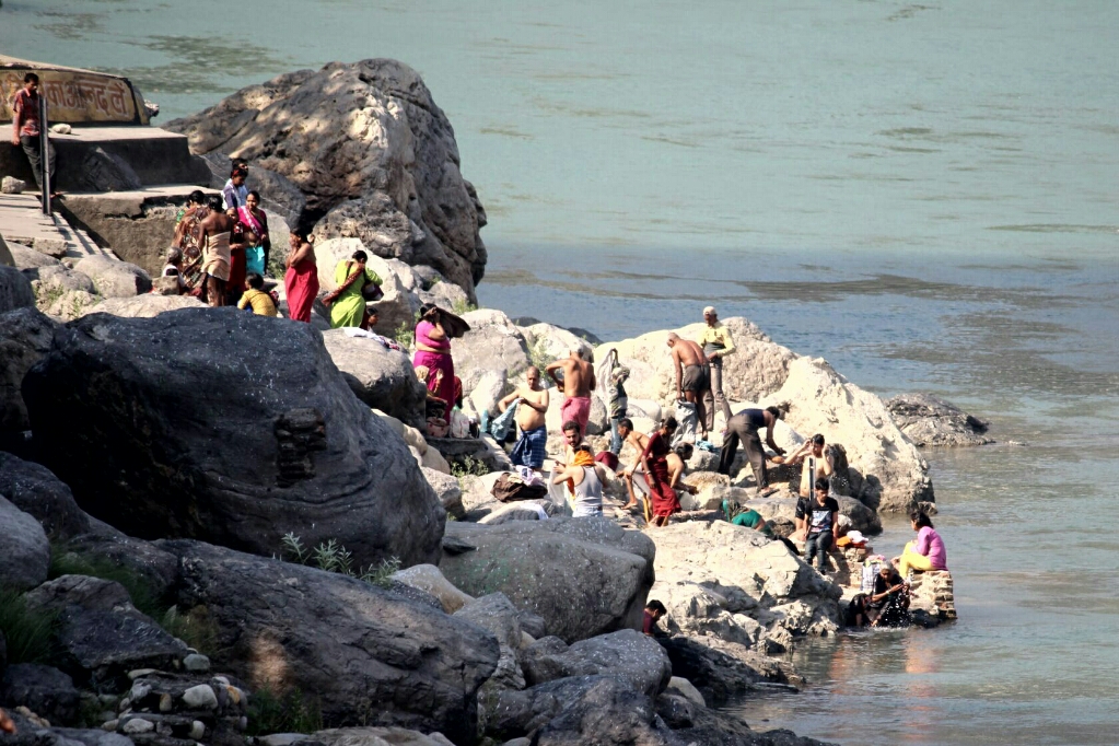 היה נחמד לראות אותם סירה אחרי סירה, והיו מקומות בהם היה חול ליד המים ואנשים התרחצו. נראה היה שכל החותרים בסירות והמתרחצים היו הודים, כעדות נוספת לגידול בתיירות הפנימית שמתחולל בהודו. המשכנו לעלות בכביש ולא ראינו שום ירידה לדרך העפר שזכרנו ליד הנהר. החלטנו לחזור, ובדרך ירדנו לחוף במקום בו הודים התרחצו, אך אי אפשר היה להמשיך לכיוון העיר, וחזרנו לכביש ולגשר החבלים, ממנו ראינו את המתרחצים על מדרגות הגהאת הגדולות, ממש לידו.