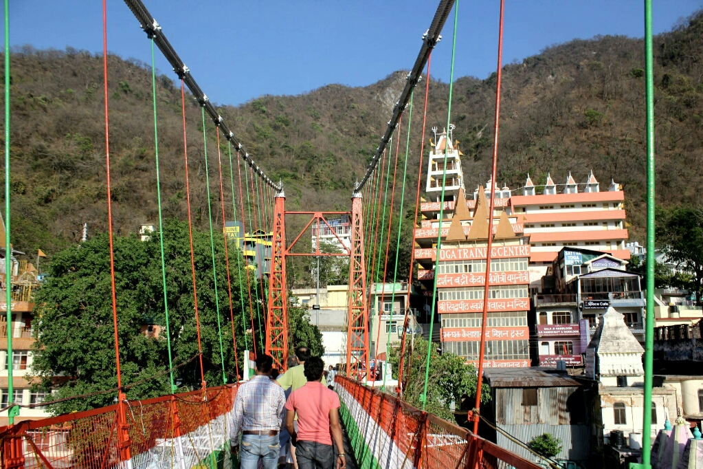 המשכנו ללכת והגענו לרחוב היורד לגשר החבלים, שכולו חנויות מזכרות צפופות וקבצנים לבושים כסאהדוהים, ראינו את הGerman bakery המפורסם המקורי, הראשון בסדרה ארוכה של מסעדות דומות ברחבי הודו, וחצינו את הנהר על גשר החבלים. מיד אחרי הגשר הייתה הכיכר הקטנה עם פסלי האלים הצבעוניים, שמעליה מתנשא האשרם והמקדש הגבוה, שכל עולי הרגל ההינדים מטפסים על המדרגות התלולות המסובבות אותו ומצלצלים בפעמון. שמחנו לראות שהמקום הקדוש הזה לא השתנה, וחזרנו על הגשר לשבת קצת בGerman bakery וליהנות מהרוח והמאווררים שהגבירו אותה.