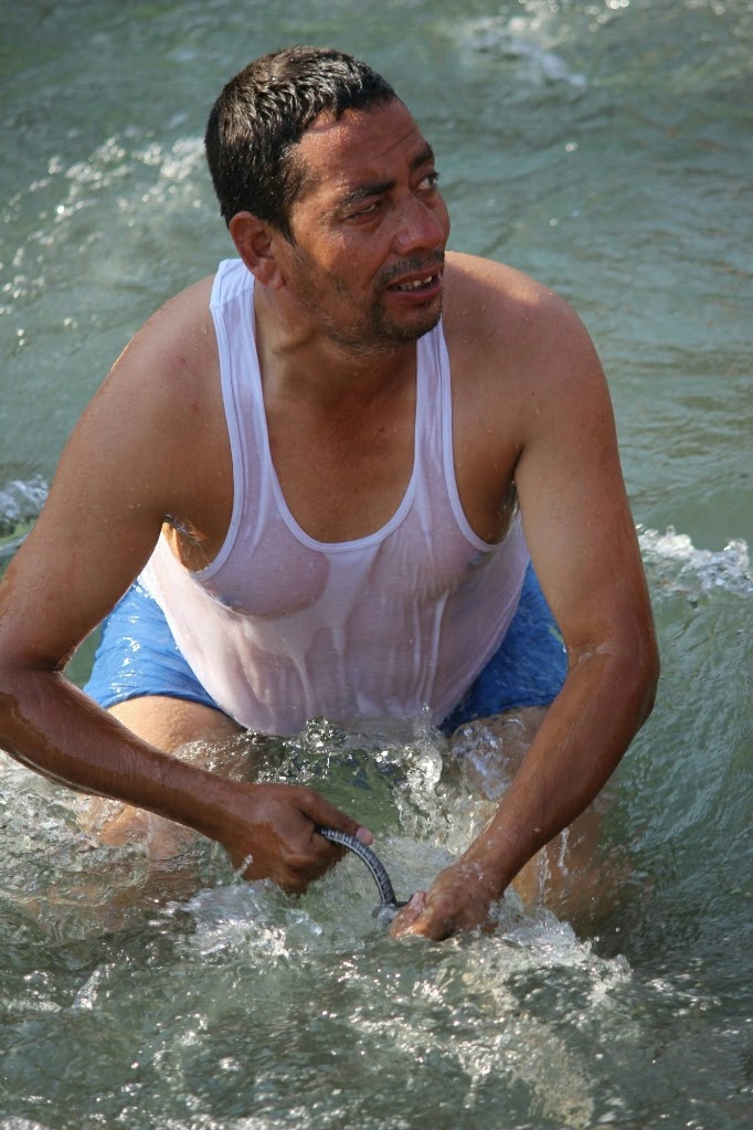 היה חם מאוד ובגדה שממול למקדשים לא היה צל, אז ישבנו על המדרגות בגדה האחרת והתבוננו בהמונים שירדו לנהר והתרחצו, הנשים במלוא בגדיהן והגברים עם תחתונים בלבד. כולם צחקו והשתעשעו במים הנקיים והקרים, ותפסו את שרשרות המתכת במים כדי לא להיסחף בזרם החזק. כל הזמן אנשים עלו מהמים והתלבשו, הגברים החליפו תחתונים מתחת למגבות והנשים הלכו לשירותים וחזרו לבושות בבגדים יבשים.