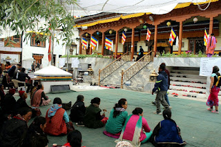 לה השתנתה מאוד מאז שהיינו בה, והרחוב הראשי שזכרנו הפך למדרחוב ענק, עם חנויות לתיירים ומסעדות, וגם חנויות רגילות לבגדים ולמוצרי חשמל או לקוסמטיקה. חיפשנו כמה דברים ומצאנו, ובינתיים התחיל להתענן וגם לטפטף קצת. פתאום ראינו מקדש גדול שנמצא מתחת למדרחוב והרחבה הגדולה לידו מלאה באנשים היושבים על הרצפה או על מדריגות היוצרות אמפיתיאטרון קטן. ברמקול שמעו את הדקלום הטיבטי המוכר ממקלאוד, באותם הטעמות מוסיקליות אך כנראה שזה היה בלאדאקית מפני שהלאדאקים אינם יודעים טיבטית. ירדנו למטה וישבנו על המדרגות שהקיפו את הרחבה וניסינו להבין מה האירוע. אף אחד לא ידע והחלטנו להיכנס למקדש ולראות.