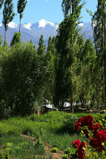 הלכנו לupper changspa, כלומר הכפר שעדיין מתפקד ליד הרחוב התיירותי בו אנחנו גרים, וראינו שגם שם יש גסטהאוזים יפים ואפילו מלון גדול ומפואר, אבל הכל שקט מאוד ואין בכלל חנויות. המשכנו בלי לדעת לאן אנחנו הולכים בשבילים הצרים בין קירות בתים שתעלת מים צלולים זורמת לצדם, ומצאנו את עצמנו בכפר עם פרות וחמורים שהולכים על הכביש הצר, ואז ראינו כמה גסטהאוזים קטנים ונעימים ונעצרנו בשער של אחד מהם, מפני שהייתה בחצר גינת פרחים מרהיבה ואפי רצה לצלם. אישה לאדאקית צעירה וקטנה הזמינה אותנו להיכנס, והציעה לנו כוס תה. נענינו בשימחה, ואפי המשיך לצלם עוד ועוד כי היו המון פרחים גדולים ופרפרים ודבורים ענקיות כמו בתיאורי אביב סטריאוטיפיים. הגסטהאוז היה מקסים, קומה אחת וחלונות גדולים בכל החדרים אל הגינה, ומהחצר אפשר היה לראות את ההרים מסביב. שתינו ואז האישה שאלה איפה אנחנו מתגוררים וסיפרנו שבקרוב נצא לעשרה ימים של מדיטציה בסטוק. שאלנו כמה עולה חדר והיא הראתה לנו חדר שנראה ממש נחמד, ועוד יותר מזה החלל המשותף וחדר האוכל (המלון כולל ארוחת בוקר!) היה מכוסה שטיחים וכריות צבעוניות מסביב ושולחנות קטנים ליד כל מושב. המקום נראה כל כך ביתי ומזמין כמו שזכרתי בhomestay שהיינו בו בנוברה וואלי בביקור הקודם. מיד נדברנו שנבוא ביום שהריטריט ייגמר ולקחנו כרטיס שלה.