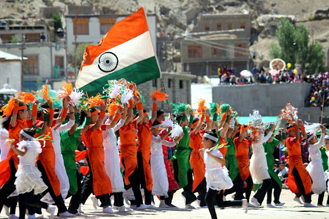בניגוד להם ילדי בתי הספר השונים הופיעו בליווי מוזיקה הודית בוליוודית קצבית וניענעו את גופם בהתאם, ואפילו היה בית ספר שהריקוד לווה בראפ הודי ותנועות הגוף היו בהתאם… הרבה בתי ספר הוסיפו גוון חינוכי מפורש יותר משימוש בצבעי הדגל והילדים היו לבושים כבני הדתות השונות, נוצרים, מוסלמים, הינדים ואפילו סיקים עם תרבוש גדול. כולם רקדו במקצועיות מרשימה אבל אני מוכרחה להודות שבית ספר לונדון, שבו לומדות בנותיהם של בעלי הבית שלנו נתן הופעה מרשימה ביותר, עם השקעה בתלבושות אחידות ובמטריות בצבעי הדגל, כנראה שלבית ספר פרטי יש יותר משאבים מאשר לבתי הספר הממשלתיים. בית ספר אחד הופיע בריקוד חינוכי עם מטאטאים ופחי אשפה וכרזות חינוכיות נגד עישון ואפילו כמה תלמידים שהתחזו לשיכורים והפכו לפיכחים במהלך הריקוד בעזרת התלמידים.