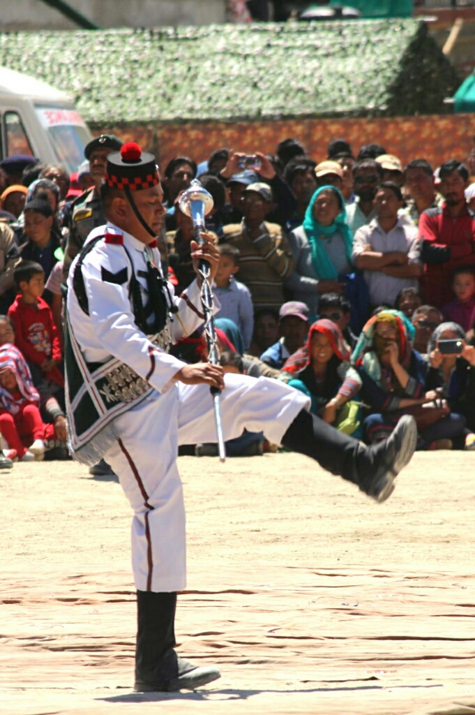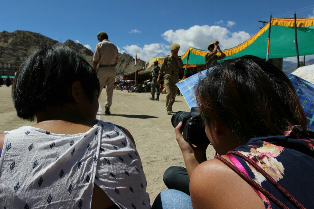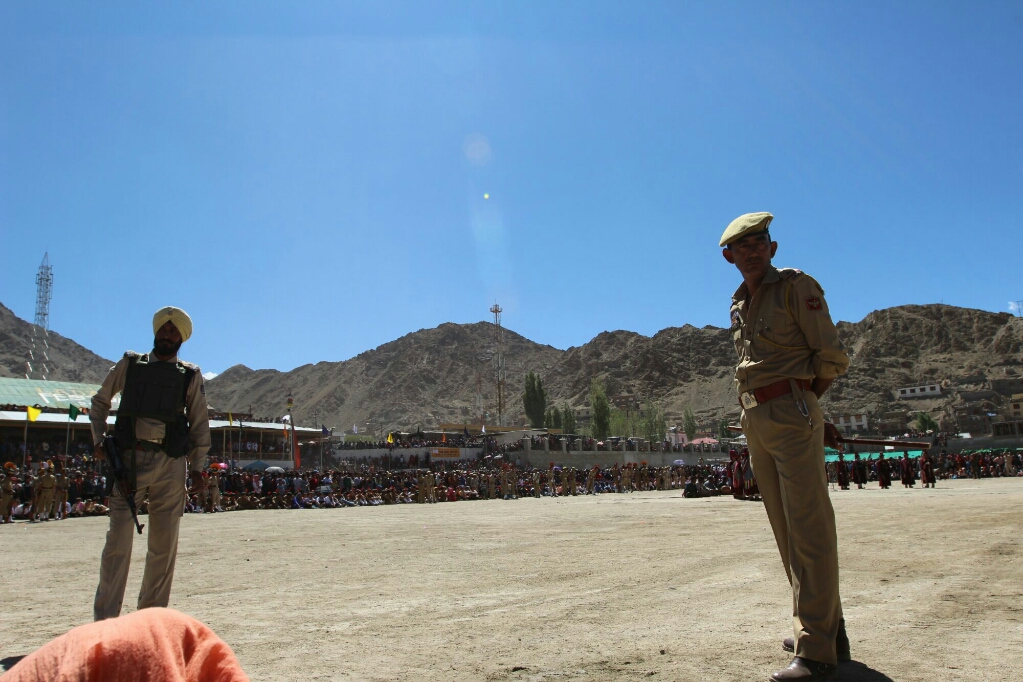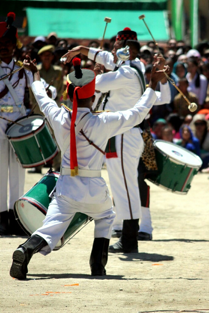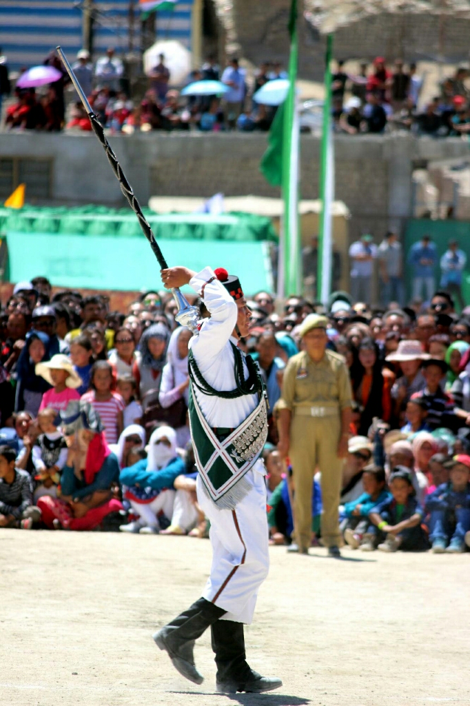 טאשי, בעלת הבית שלנו, נדחפה בקלילות עם בתה ואמא שלה קדימה ורמזה לנו לבוא בעקבותיה. התיישבנו בשורה הראשונה ומשם ראינו את כל ההופעות. המגרש הענקי היה מקושט בדגלי הודו ובצבעי הדגל. ההופעות היו שילוב של פולקלור לאדאקי בביצוע להקה מקומית שכללה נשים בתלבושות הצבעוניות וכובעי הקוברה בצבע התכלת העז ורקדנים גברים בכובעים בצבע זהוב בליווי תזמורת מסורתית של תופים וחצוצרות. הם רקדו לאט מאוד כמו שכבר ראינו בהזדמנויות קודמות למרות המוזיקה הקצבית ועליזה של התזמורת.