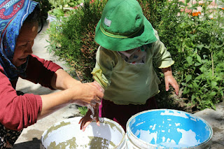 חזרנו מהריטריט, אשתו של וויווק הביאה אותנו לגסטהאוז הנחמד שמצאנו לפני הריטריט, לא היה בו מקום אבל הם היו מאוד נחמדים והתנצלו והובילו אותנו לגסטהאוז השכן, שנראה ממש דומה לשלהם, רק הגינה פחות מסודרת ומרוכזת והמקום יותר גדול. מיד הסכמנו להישאר, ועלינו לחדר הצופה אל הגינה ואל פסגות ההרים המושלגים שאפשר לראות בישיבה במיטה. הלכנו לאכול במסעדה הקרובה והגשמתי את הפנטסיה שעלתה בי מדי פעם בזמן הריטריט: סלט ירקות גדול ומשביע, ואפי הגשים תענוג שלו: פנקייק בננה. הגסטהאוז קצת רחוק מהעיר ומצ׳אנגספה, אבל בכל זאת הלכנו לעיר ואכלנו צהריים וחיפשנו כל מיני דברים שנגמרו לנו וגם חיפשנו מידע על נסיעה לאגם ועל הטיצ׳ינג של הדאלאי לאמה. בערב אכלנו בגסטהאוז השכן, השכנים שלא היה להם מקום בשבילנו הזמינו אותנו, ופגשנו שם זוג בחורים איטלקיים חמודים, אנשי קוהנג פו ומטפסי הרים מומחים, אחד מטפל בפסיכותרפיה והשני עובד סיעוד של זקנים. אחר כך הגיעה משפחה צרפתית מקסימה עם שני ילדים בני עשר ושמונה, שעשו טרק קשה לבדם, בלי סוסים ומדריך, כשהאבא סוחב את כל הציוד בעגלה קטנה שקשר לעצמו. הילדים נראים מקסימים שקטים ונחמדים וההורים סיפרו שאין לה טלוויזיה ואין לילדים טאבלטים או משחקי מחשב! הם היו ממש ידידותיים וסיפרו על הדרך חזרה במכונית שנעצרה כי הכביש היה חסום הסלעים ענקיים שנפלו והם חיכו עד שהגיעו אנשים מרשות הכבישים ופוצצו בדינמיט את הסלעים. בכל פעם, וזו הפעם השלישית במסע שלנו, שאנחנו פוגשים צרפתים ידידותיים אני שמחה במיוחד, מפני שזה שובר את הסטריאוטיפ שנוצר בי ממיפגשים קודמים עם צרפתים ואני שמחה להיווכח שהדיעה הקדומה שלי אינה נכונה.