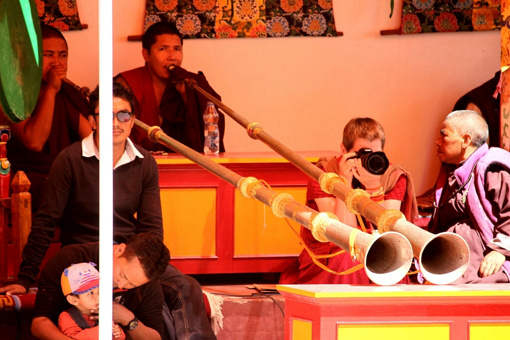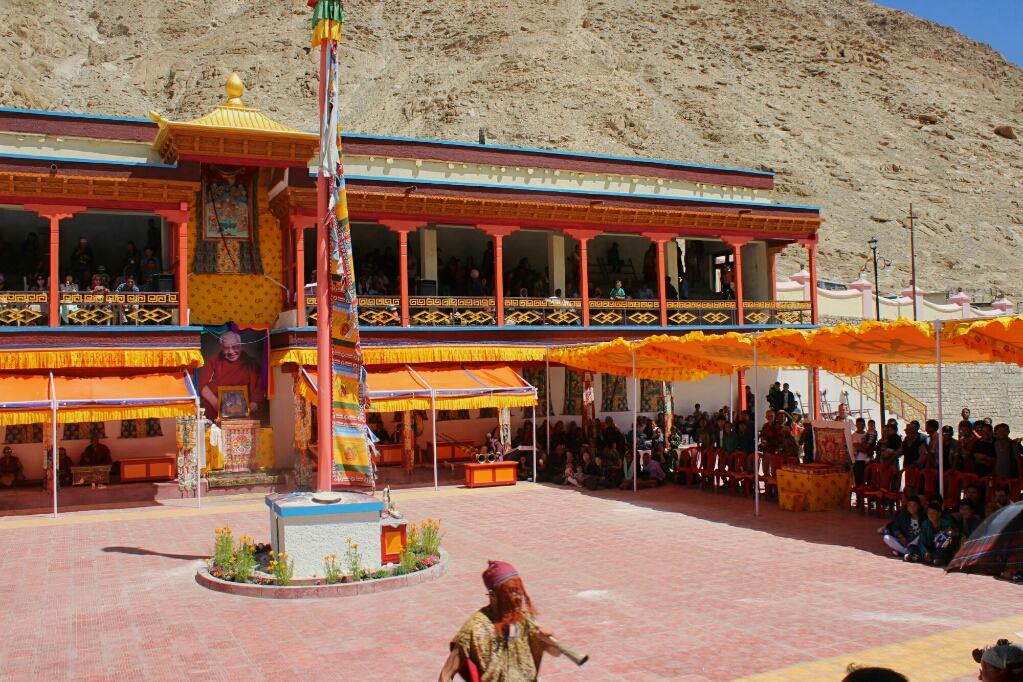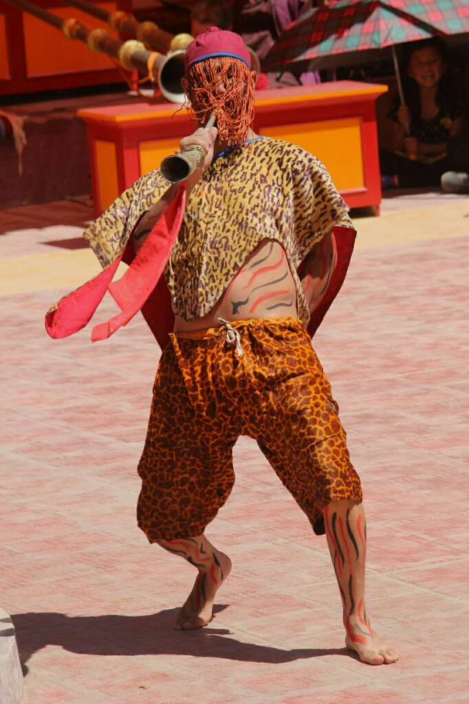 הגענו למנזר והתמקמנו בנקודות שנראו לנו נוחות ובינתיים צפינו ב״comic relief״ כלומר שני נזירים שלבושים בתלבושת מצחיקה ומסכות גדולות על פניהם, אבל הם בעיקר מבדרים את הקהל בהפסקה ומפזרים אבקה לבנה מתוך החצוצרות שלהם על הקהל שצוחק ובורח מהאבקה. הם טיפסו על הקומה השניה בה היו הרבה מאוד אנשים על המושבים והיה נחמד לראות את המקומיים צוחקים ונהנים מהטריקים הפשוטים שלהם. בכלל למרות שבצד אחד מתחת לגגון בד צבעוני היו כיסאות ממוספרים של תיירים ששילמו והזמינו מראש, רוב הקהל היה מקומי והרבה תיירים עזבו בהפסקה ואפשר היה לשבת במקומות שלהם.