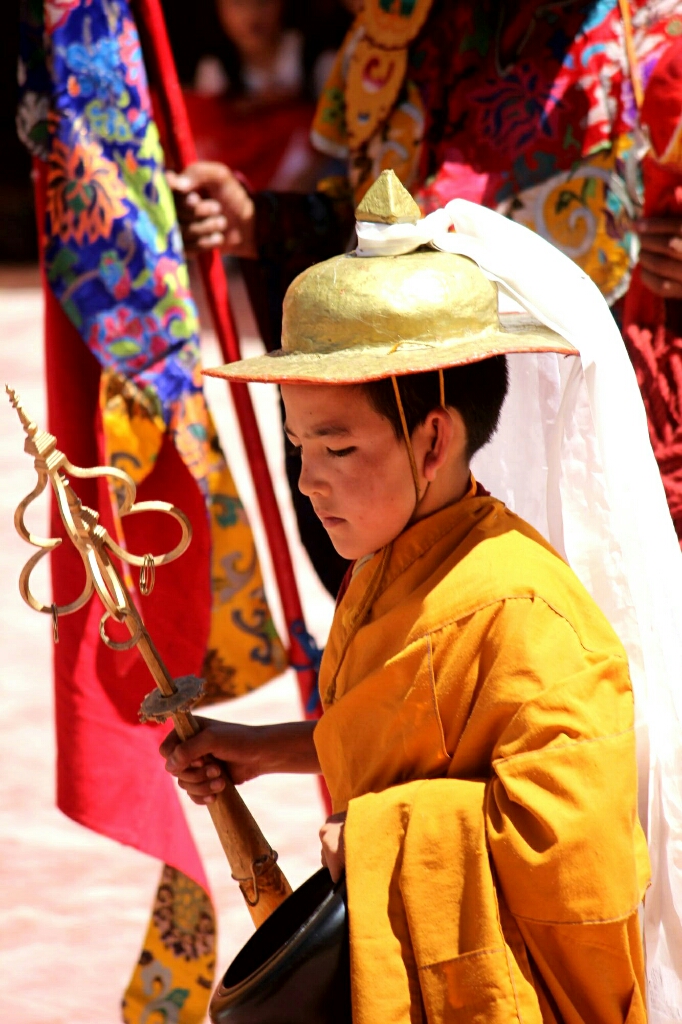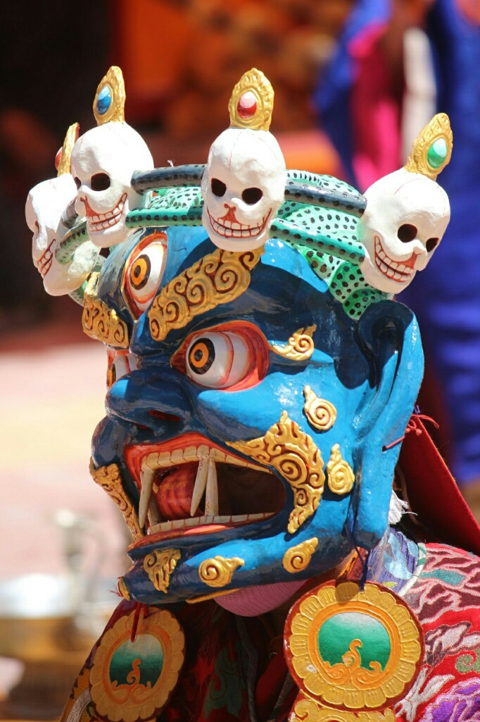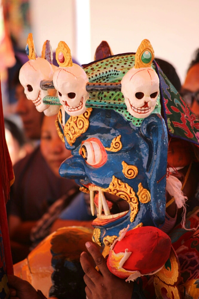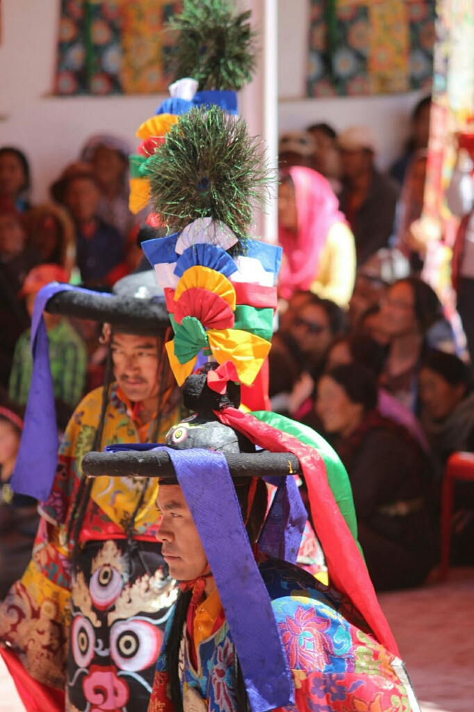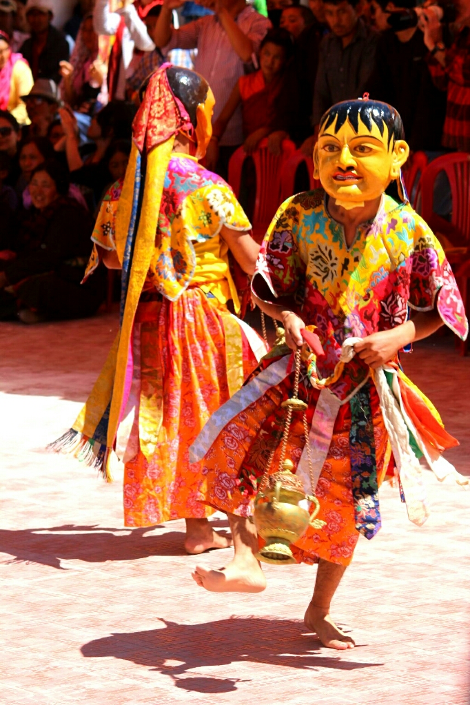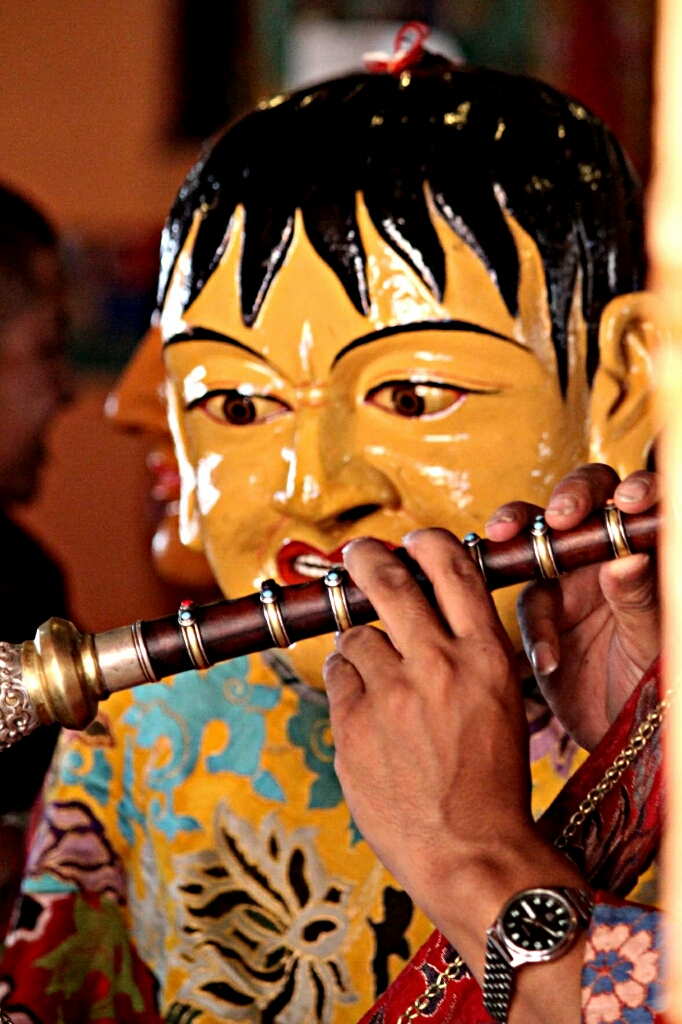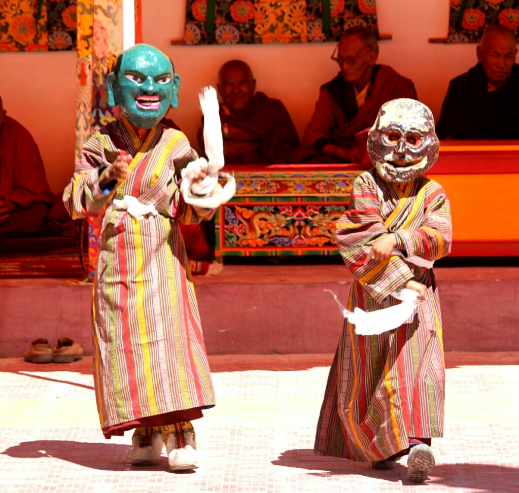 סוף סוף הרקדנים האמיתיים יצאו מהמקדש לבושים בתלבושות הצבעוניות היפות ומחזיקים בידיהם צעיפים או חרבות עץ ורקדו בריקוד האיטי והעדין שלהם, קופצים בקלילות על רגל אחת ומסתובבים, וחוזר חלילה. הם עשו סיבוב ברחבה ואחר כך התיישבו על כיסאות בצד כשבמרכז יושב הנזיר עם המסיכה המרשימה של פני המפלצת המעוותים. ואז היו ריקודי ׳סולו׳ של שני נזירים בכל פעם, חלקם צעירים מאוד ועדיין אינם חובשים מסיכות, ואז נכנסו שני רקדנים בכירים יותר בתלבושת צבעונית כשאשפות של חצים וקשת תלויות להם בצדי הגוף והם מחזיקים חרבות ומגינים בידיהם והמסתובבים ברחבה בתנועות מאיימות. אחרי הריקוד הזה הייתה הפסקה קטנה ויצאנו למכונית שחיכתה לנו למטה.