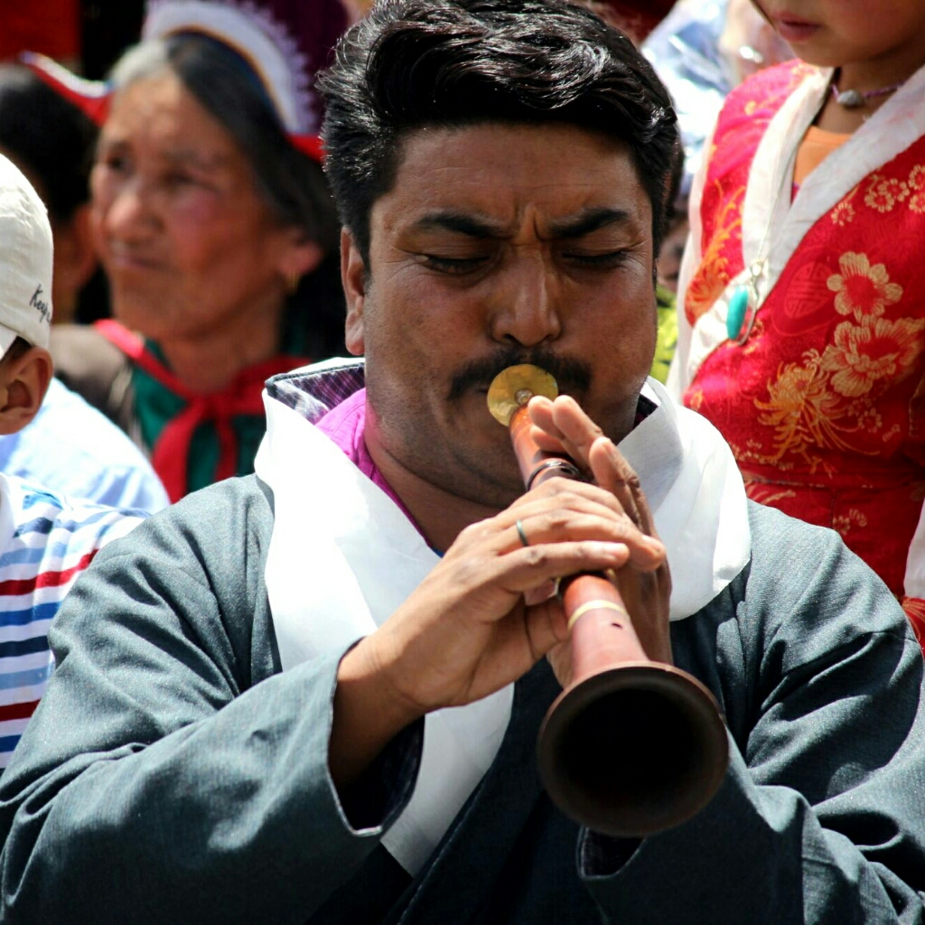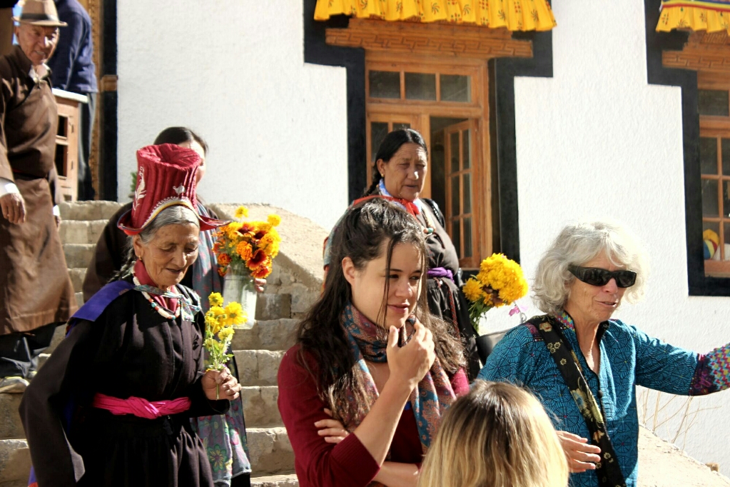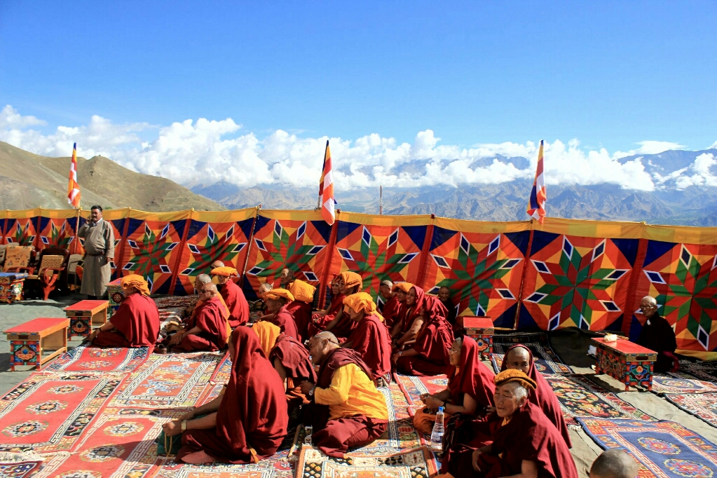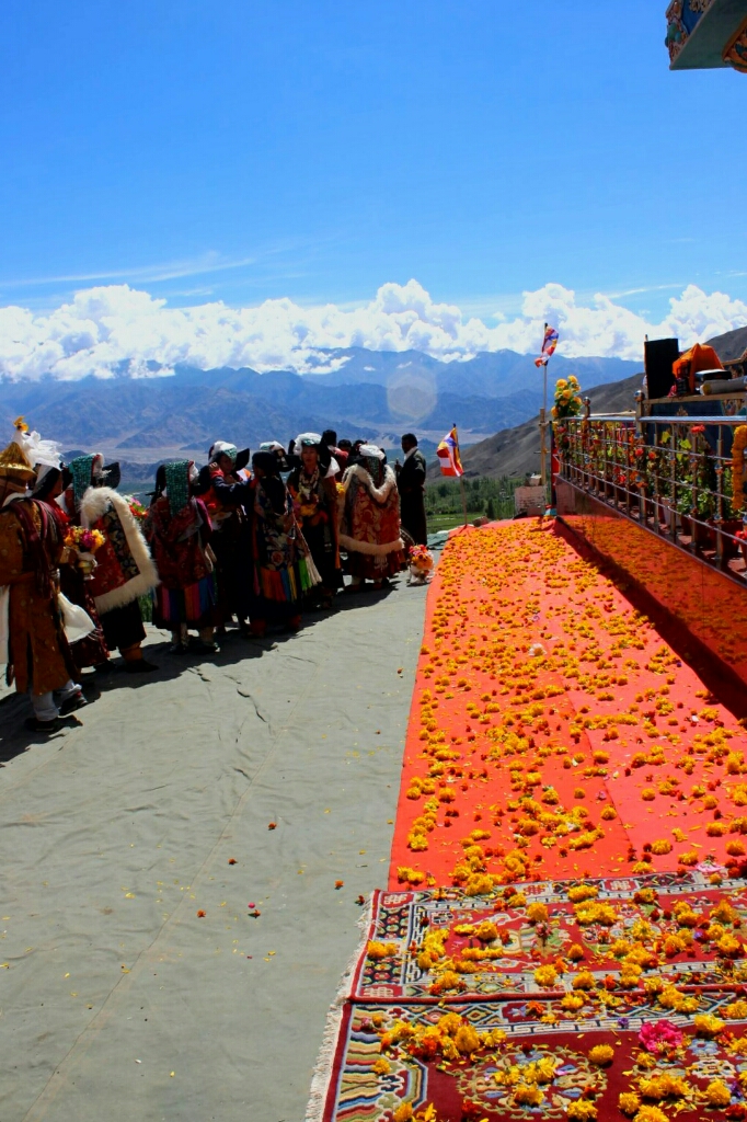 קבוצה קטנה של זרים ישבה כבר על הברזנט וחיכתה, הצטרפנו אליהם והתברר שהם מבלגיה וחלקם לפחות דיברו ביניהם פלמית. היו שם גם ילדים וכולם ישבו בסבלנות וחיכו בשמש שהלכה והתחזקה מרגע לרגע. השעה כבר הייתה עשר, והרחבה הייתה מלאה לגמרי, בעיקר במקומיים אך היו גם קצת תיירים שהסתובבו וצילמו או שישבו וחיכו לידינו. כל הזמן נשמעו הסברים בלאדאקית וגם באנגלית והמליצו לזרים להתאסף ליד המתרגם שיתרגם לאנגלית את דברי הדאלאי לאמה. לקראת השעה 11 ההתרגשות הגיעה לשיאה, התזמורת התחילה לנגן בתופים ובחצוצרות הלאדאקיות היבבניות, ואפי רץ לצלם את שיירת המכוניות העולה. השטיח האדום שעליו עמד הדאלאי לאמה לפסוע היה מכוסה בפרחים,